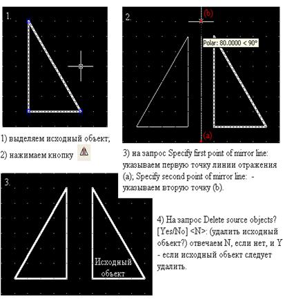 Инструмент позволяет зеркально отобразить выделенный объект относительно заданной оси. Порядок использования команды приведен на рис. 4.7.