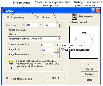 Команда позволяет создать копии исходного объекта в прямоугольных или полярных координатах (рис. 4.9).