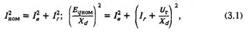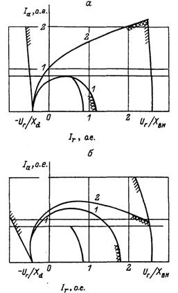 представляющие собой уравнения окружностей, первая из которых, с центром в начале координат, определяет геометрическое место точек, соответствующих номинальному току статора, а вторая, с центром в точке {Ia=0; Ir=-Uг/Xd}, — геометрическое место точек, соответствующих номинальной эдс (току возбуждения) машины. Общее множество, образованное этими окружностями, заштриховано на рис. 3.1 и представляет собой совокупность режимов, в которых может работать данная синхронная машина. (Во всех точках этого множества токи и напряжения в обмотках машины не превышают номинальных значений). При этом верхняя полуплоскость (Ia > 0) соответствует генераторному режиму работы, нижняя (Ia < 0) — двигательному, а ось абсцисс (Ia =0) — режиму синхронного компенсатора. Значения Ir > 0 соответствуют режимам генерации реак-