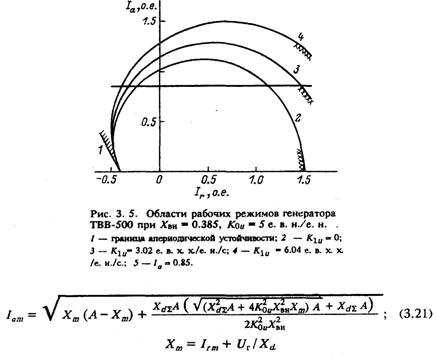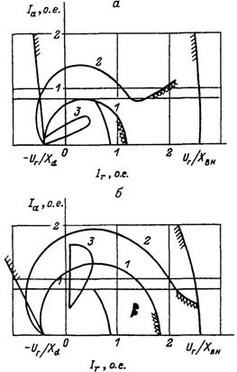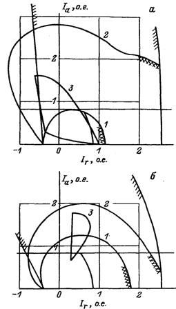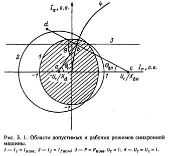 Графически им соответствуют на рис. 3.2 отрезок оси абсцисс, лежащий левее точки Ir=-Uг/Xd, и окружность 3 со смещенным относительно начала координат центром: