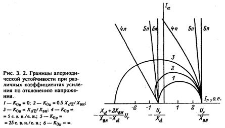 Полученные выше соотношения дают возможность без применения специализированных программ нанести на диаграмму режимов синхронной машины границы апериодической и колебательной статической устойчивости при регулировании возбуждения по отклонений и по первой производной напряжения генератора. Исходными данными служат параметры исследуемого генератора или эквивалентного генератора станции и значение Хвн. Порядок расчетов следующий: