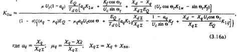 Таким образом, в каждом конкретном режиме регулируемая машина может быть замещена нерегулируемой, у которой обеспечивается постоянство эдс за сопротивлением Хр. Будем считать, что за счет ручного или медленного астатического регулирования обеспечивается одно и то же значение Uг и величина Eq в (3.11) соответствует этому значению. Отсюда следует, что при заданном коэффициенте усиления К0u величина Хр в общем случае не постоянна, а зависит от параметров режима.