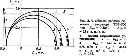 В результате получим область рабочих режимов, представляющую собой внутреннюю часть построенных областей. Анализируя ее (рис. 3.4 и 3.5), можно решить, справится ли пропорциональный регулятор со стабилизацией всех возможных режимов, следует ли уменьшать коэффициент усиления по напряжению или предусмотреть сильное регулирование возбуждения. При этом нужно иметь в виду, что для обеспечения приличного качества регулирования необходимо иметь запас устойчивости в каждом из режимов.