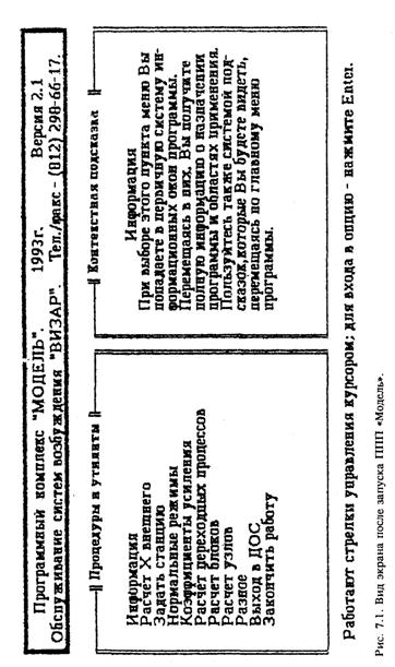 На рис. 7.1 показан вид экрана при запуске программы «Модель». В левом окне перечислены все модули и утилиты ППП. При подсвечивании маркером любой строки этого окна в правом окне появляется краткая контекстная подсказка. Ниже приведены тексты этих подсказок и результаты расчетов, выполняемых в каждом модуле.