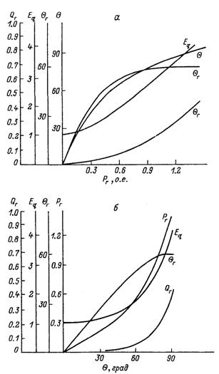 Рис. 7.3. Статические характеристики электропередачи в зависимости от активной мощности (а) и полного угла (б).