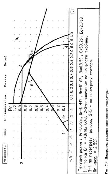 — активную мощность и напряжение эквивалентного генератора и модуль напряжения U в центре электрических качаний. На основе этих данных определяются все параметры, характеризующие режим электропередачи: Рг, Qг, Uг, Uс, Еq, Θ, Θг. Есть возможность графического построения диаграммы режимов в координатах Р—Q или Ia —Ir и нанесения на нее интересующего Вас режима. Кроме того, программа предоставляет возможность получить в табличной или графической форме статические характеристики электропередачи в зависимости от активной мощности или полного угла, запомнить их, повторить расчет и совместить на дисплее результаты для различных вариантов. По желанию пользователь может получить жесткую копию экрана дисплея.