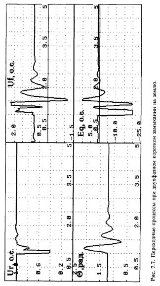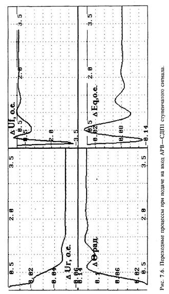 На рис. 7.6 приведены переходные процессы для некоторых переменных при подаче на вход АРВ ступенчатого сигнала, приводящего к снижению напряжения генератора на 5 %, на рис. 7.7 — при расчетном коротком замыкании.