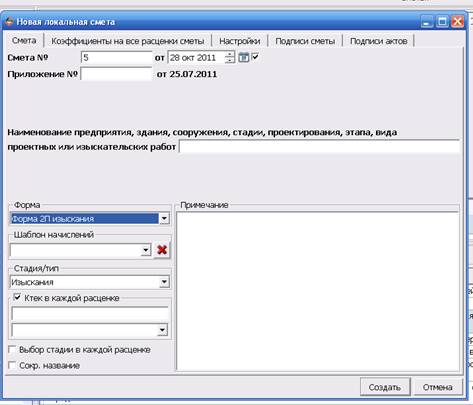 1) В окне создания сметы указываем все необходимые параметры будущего сметного расчета и выбираем стадия «изыскания», форму «2п изыскания».