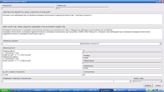 При добавлении появляется окно, в котором видно название расценки ее характеристики, обратите внимание, что инфляционный коэффициент оставляем равным «1»: