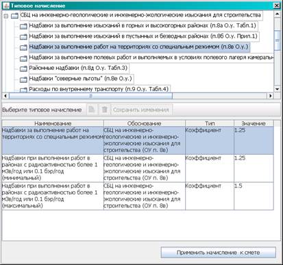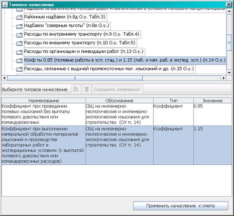В открывшемся списке находим «СБЦ на инженерно-геологические и инженерно-экологические изыскания в строительстве» и выбираем необходимое начисление и нажимаем кнопку «Применить начисление к смете»: