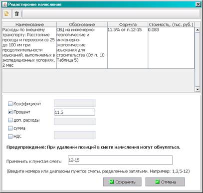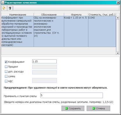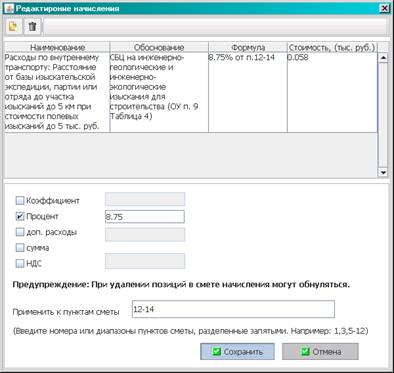 В окне «Начисление сметы» автоматически появляется соответствующие название, тип и значение, остается лишь указать пункт сметы, к которому применяется указанное начисление: