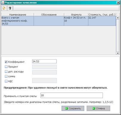 В приведенном примере «Всего по смете» будет равно значению предыдущего начисления, т. е. «Всего с учетом инфляционного коэф. 34,53», соответственно в графе «применить к пунктам сметы» оставляем лишь «19»
