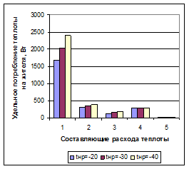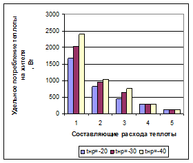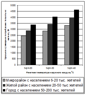 Структура потребления теплоты зависит от климатических условий и численности населения микрорайона, района или города. На рис. 1 представлены диаграммы, отображающие удельное потребление теплоты в расчете на одного жителя в зависимости от численности населения и расчетной температуры наружного воздуха. Результаты получены по методу расчета потребления теплоты по укрупненным показателям. Такими показателями являются удельные характеристики зданий по отоплению, вентиляции и горячему водоснабжению. Из рассмотрения диаграмм видно, что с понижением расчетной температуры наружного воздуха удельное потребление теплоты растет, а с ростом численности жителей населенного пункта удельное суммарное потребление теплоты (рис. 2) растет за счет роста потребления теплоты системами отопления и вентиляции общественных зданий.