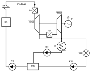 КО – котельная установка; КА – котельный агрегат; ПЕ – пароперегреватель; Г – генератор; К – конденсатор; РО – регулирующий орган; ЧВД – часть высокого давления турбины; ЧНД – часть низкого давления турбины; ТП – тепловой потребитель; ПБ – питательный бак; КН – конденсатный насос.
