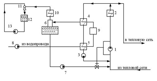 9-обратный трубопровод тепловой сети, 10-теплообменник горячего водоснабжения, 11-холодная вода из водопровода.