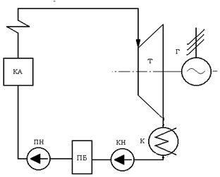 КА – котельный агрегат; ПЕ – пароперегреватель; Т – турбина; Г – генератор; К – конденсатор; КН – конденсатный насос; ПБ – питательный бак, ПН – питательный насос
