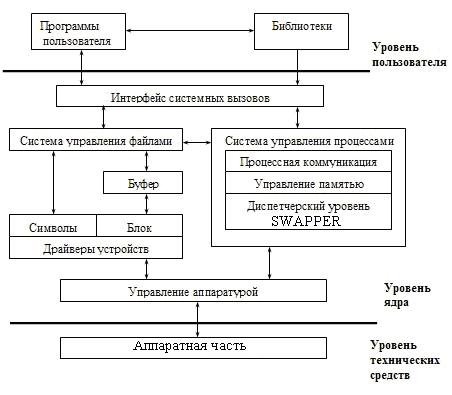 На рисунке 24 показана блок-схема ядра операционной системы UNIX. Ядро содержит системные программы, которые выполняют диспетчерские функции, и управляющие структуры данных, используемые этими программами. Все работы, выполняемые вне ядра, оформлены в виде процессов, работающих режиме "Пользователь"