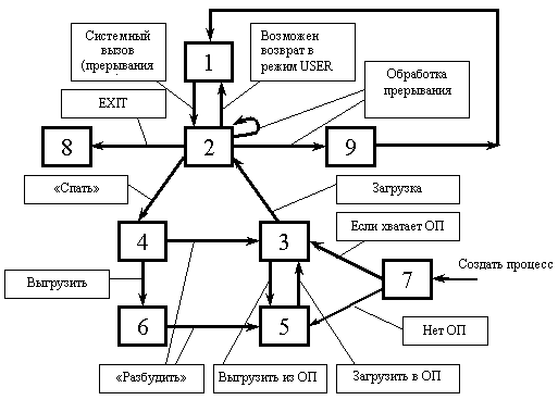 В ОС UNIX процесс в ходе своего существования может иметь одно из девяти состояний: