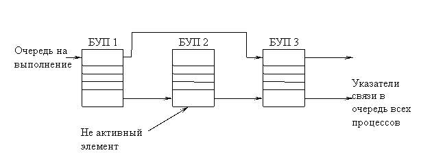 Выбор следующего процесса для диспетчеризации осуществляется несколькими способами (например, используя дисциплину RR - "круговой алгоритм"). Диспетчер циклически просматривает все БУП-ы, выбирает следующий процесс из тех, что находятся в готовности. Каждому активизированному процессу предоставляет одинаковый квант времени.