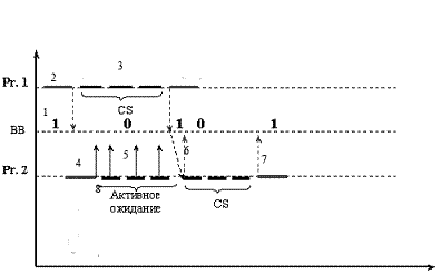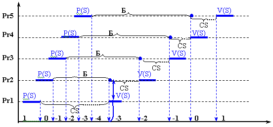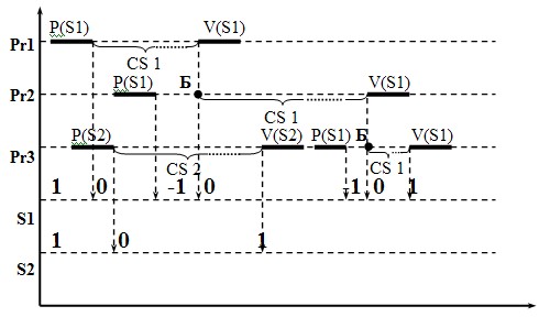 Б - блокировано, СS1 и CS2 - критические участки 1 и 2, идентифицированные семафорами S1 и S2.