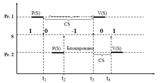 До момента t1 ресурс был не занят. В момент t1 процесс Pr1 выполняет операцию P(S) и входит в критический участок (CS).