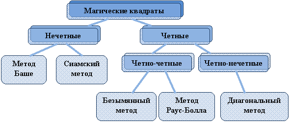 Рассмотрев некоторые методы, мы классифицировали магические квадраты по категориям: