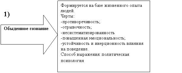 Обыденному сознанию присущи ярко выраженные психологические черты: чувства, настроение, импульсивность, эмоциональное восприятие политических событий. Поэтому способом выражения этого уровня политического сознания является политическая психология.
