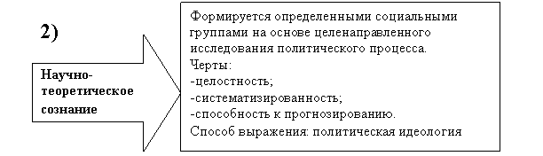 Политическое сознание системно по своему характеру, оно имеет многоуровневую структуру. Уровни политического сознания отражают глубину и адекватность отражения действительности, это определенная ступень, достигнутая социальным субъектом в познании политической реальности. По этому критерию выделяют уровни политического сознания – научно-теоретическое и обыденное, идеологическое и психологическое.