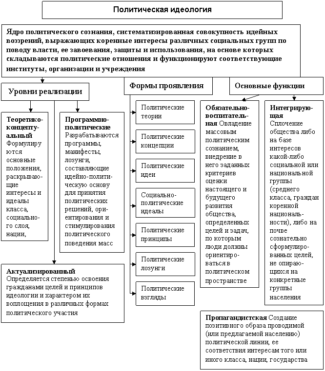 Итак, политическая идеология - это система взглядов и идей, в которых через призму групповых (классовых, национальных и др.) интересов отражаются экономические, социальные и политические отношения в обществе, даются различные трактовки общественной жизни и пути решения общественных проблем. Она формирует теоретическое самосознание социальной общности.
