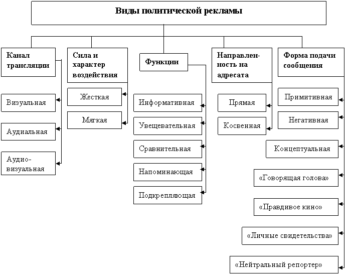 Существуют различные виды политической рекламы. В зависимости от классификационных признаков ее основные виды представлены в следующей схеме.