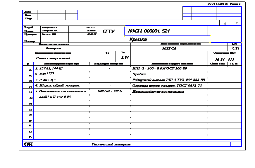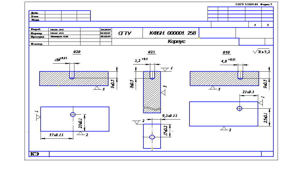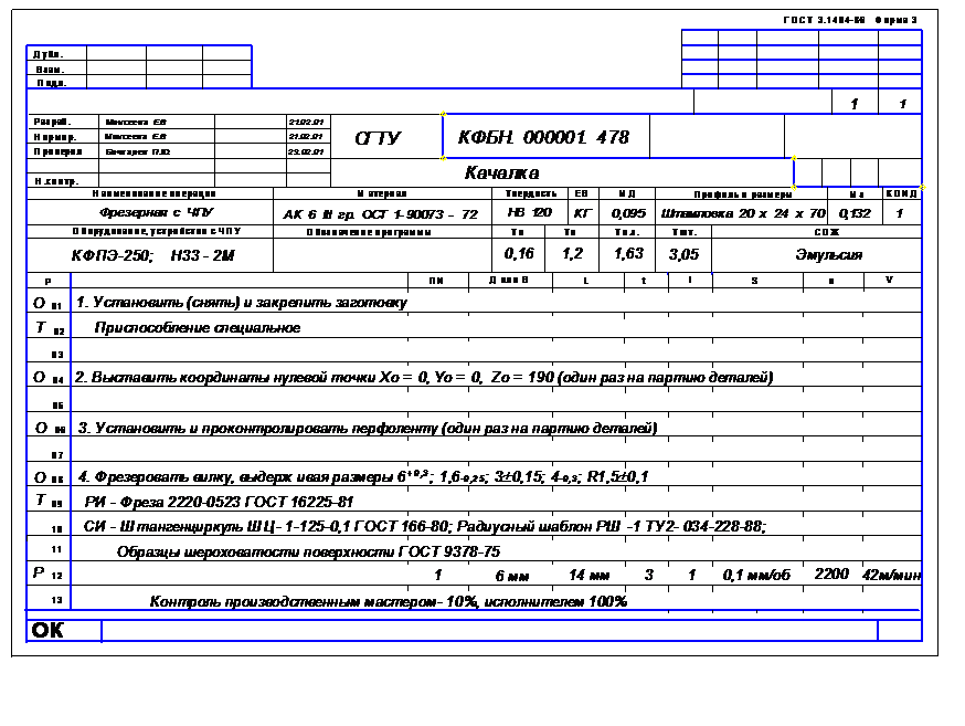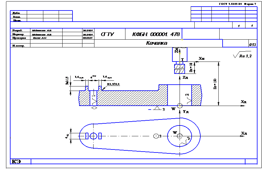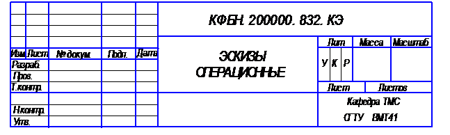 Лист операционных эскизов выполняется форматом А1, на который выносятся эскизы выполнения операций, согласованные с руководителем курсовой работы. Все операционные эскизы выполняются в произвольном масштабе, но с соблюдением пропорций. При этом обрабатываемая заготовка изображается в одном или нескольких видах, главным из которых является вид, соответствующий положению заготовки на станке перед рабочим. На всех видах заготовки наносятся условные изображения установочно-зажимных элементов приспособления, согласно требований ЕСТД. Все обрабатываемые на рассматриваемой операции поверхности изображаются в цвете, либо линиями двойной толщины (2S) с указанием, согласно ГОСТ 2.309-73, параметров шероховатости. Все получаемые размеры должны быть проставлены с допускаемыми отклонениями. На операциях, выполняемых с использованием оборудования с ЧПУ или станков-автоматов (полуавтоматов), изображается соответствующая наладка оборудования. Каждый операционный эскиз сопровождается таблицей, в которой указывается используемый режущий инструмент с обозначением по соответствующему стандарту, режимы обработки и нормы времени. В правом нижнем углу заполняется общий штамп. При выполнении графической части курсовой работы рекомендуется использовать стандарты ЕСКД, ЕСТД, а также [5].