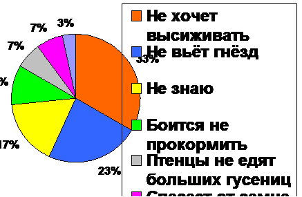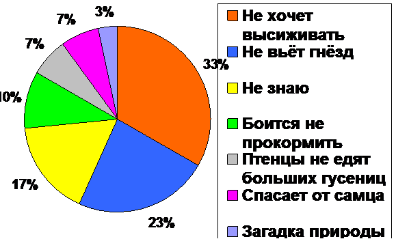На первый вопрос большинство (10 человек) отвечали, что кукушке лень высиживать яйца. На втором месте (7 человек) был ответ, что кукушки не строят своих гнёзд. Многие просто не знают, почему так происходит. Кто-то считает, что кукушка не сможет большое количество птенцов из-за прожорливости кукушат. Встречались и такие ответы: спасает яйца от самца, который может съесть их; что рацион питания взрослых особей и птенцов несколько различается (птенцы не едят больших волосатых гусениц); один человек ответил, что это загадка природы.