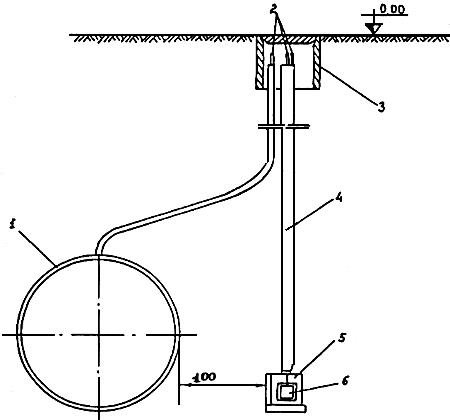 1 - трубопровод; 2 - контрольные проводники от трубопровода, электрода сравнения и датчика потенциалов; 3 - ковер; 4 - защитная трубка; 5 - электрод сравнения; 6 - датчик потенциала.