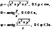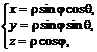 Связь координат произвольной точки Р пространства в сферической системе с координатами в декартовой прямоугольной системе осуществляется по формулам