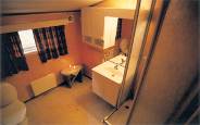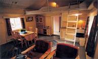 Коттеджи В (2+2): нет спальни, гостиная с лофтом (4 спальных места), полностью оборудованная кухня, душ, туалет.