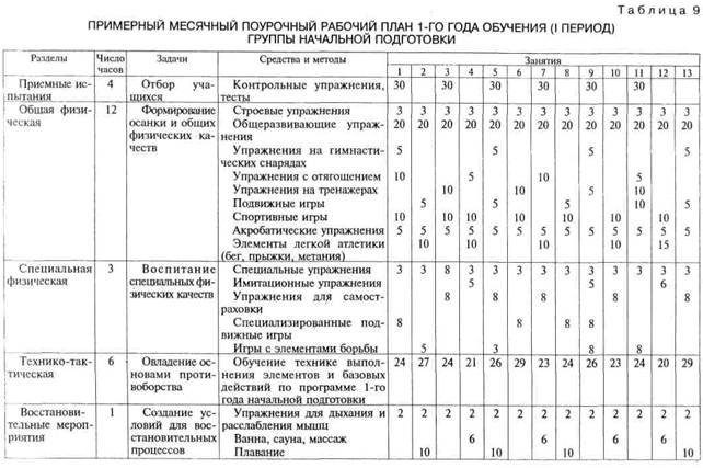 примерный месячный поурочный рабочий план 1-го года обучения (I период) группы начальной подготовки (табл. 9);