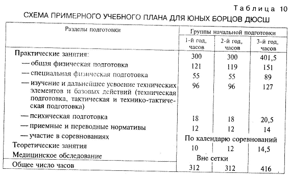 схема примерного учебного плана для борцов ДЮСШ (табл. 10);