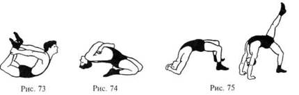 6. Лежа на животе, взяться руками за голеностопные суставы и максимально прогнуться (рис. 73).