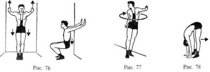 Стоя спиной к стене, опереться о нее ладонями прямых рук (пальцы «смотрят» вверх) несколько шире плеч. Держа спину прямо, медленно присесть до появления напряжения в мышцах груди и пояса верхних конечностей. Дыхание спокойное. Удерживать принятую позу 10—20 с, затем вернуться в исходное положение. Повторить 4—6 раз с отдыхом 10—15 с между повторениями (рис. 76).