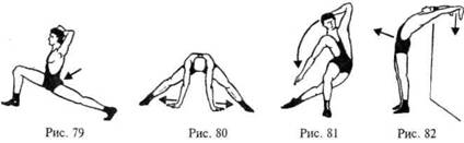 Стоя, ноги врозь (пошире), наклон вперед, прямыми руками касаясь пола, голову чуть приподнять, смотреть вперед-вниз. Медленно раздвигать руки в стороны до касания стоп. Удерживать это положение 20—30 с, затем вернуться в исходное положение. Встряхнуть мышцы ног и повторить упражнение 3—4 раза (рис. 80).