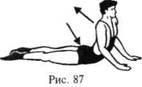 Лежа на животе, кисти рук на уровне плеч. Выпрямить руки «до отказа», прогнуться. Удерживать это положение 15—20 с, затем вернуться в исходное положение. Дыхание спокойное. Повторить 3—4 раза (рис. 87).