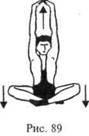 Сидя, скрестив ноги с сильно разведенными коленями, руки на бедрах, спина прямая. Соединив кисти ладонями вверх, руки вверх. Удерживать позу 10—20 с, затем вернуться в исходное положение. Повторить 6—8 раз с отдыхом 5—10 с между повторениями (рис. 89).