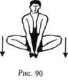 Сидя на полу с согнутыми ногами. Колени расслабленно развести в стороны, ступни как можно ближе к телу подтянуть руками. Удерживать положение 20—30 с, затем вернуться в исходное положение. Повторить 6—8 раз с отдыхом 30 с между повторениями. Если при выполнении упражнения таз вывести немного вперед, растягивание усиливается (рис. 90).
