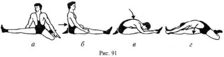 Сидя в положении барьерного шага, стопа согнутой ноги подтянута к ягодицам, туловище вертикально. Мышцы растянуты уже в этой позиции (рис. 91, а). Выведением таза вперед растягивание усиливается (рис. 91,6). Когда гибкость улучшится, можно усложнить упражнение, наклонив туловище к вытянутой ноге (рис. 91, в). В последнем положении растягивание может быть существенно больше, если обхватить обеими руками ступню выпрямленной ноги и подтянуть туловище вплотную к ноге, голову опустить (рис. 91, г). Дыхание спокойное. Повторить по 3—4 раза, сменив положение ног, с отдыхом 6—10 с между повторениями.