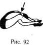 Сидя с согнутыми под прямым углом и слегка разведенными коленями, ступни параллельно на ширине плеч. Вывести таз вперед и наклонить туловище вперед, обхватив руками голени с внутренней стороны и положив кисти на ступни. Подтянуть руки на себя так, чтобы наклон увеличился до заметного растягивания. Удерживать это положение 20 с, затем вернуться в исходное положение, расслабиться. Повторить 6—8 раз с отдыхом 5—10 с между повторениями (рис. 92).