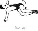 Лежа на спине, ноги сильно согнуты в коленных и тазобедренных суставах, руки в стороны. Наклонить ноги в сторону, не отрывая рук от пола. Чем сильнее это движение, тем интенсивнее растягивание. Удерживать позу 20—30 с, затем вернуться в исходное положение. То же — в другую сторону. Повторить 6—8 раз с отдыхом 5—10 с между повторениями (рис. 93).