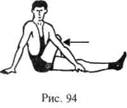 Сидя с выпрямленными ногами. Согнув правую ногу, поставить стопу снаружи от выпрямленной левой ноги; опереться левым плечом о согнутое колено, а кистью — о выпрямленную левую ногу; спина прямая. Удерживать позу 20—30 с, затем вернуться в исходное положение. То же, поменяв положение ног. Дыхание спокойное. Повторить 4—6 раз с отдыхом 10—15 с между повторениями (рис. 94).