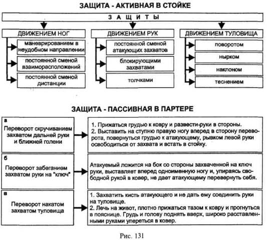 Здесь нами рассматривается содержание активной защиты в стойке (рис. 131). Обучение пассивной защите в партере предлагается в программе для детско-юношеских спортивных школ (1977 г.), поэтому данную тему мы не будем рассматривать. Кроме того, в учебнике «Спортивная борьба» [37] этот вопрос описан достаточно хорошо.