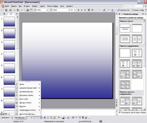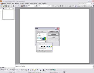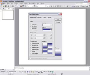 Учитель: Для того чтобы создать фон открываем: «Формат – Фон – Способы заливки – Выбрать цвета (один, два и т. д.). Можно выбрать тип штриховки и затем нажать «ОК». Если вы хотите применить ко всем слайдам этот фон, то нужно нажать «применить ко всем слайдам» или к одному, то – «применить».