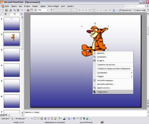 9. Для вставки гиперссылки нужно: выделить рисунок или объект – нажать правую кнопку мышки – Гиперссылка – связать с файлом –либо «Имеющемся файлом», либо «месте в этом документе» и выбираете слайд, который вам нужно; либо «новым документом».
